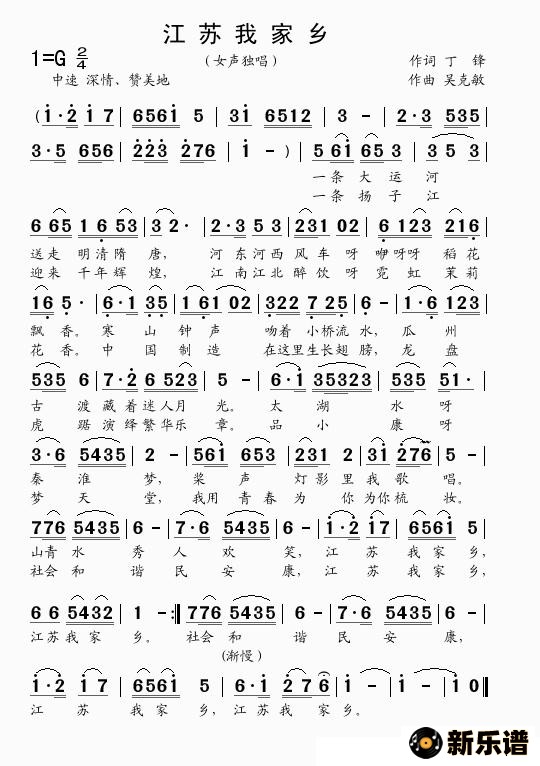 演唱的江苏我家乡(独唱 丁锋词 吴克敏曲)歌词,江苏我家乡(独唱 丁锋词 吴克敏曲)简谱.