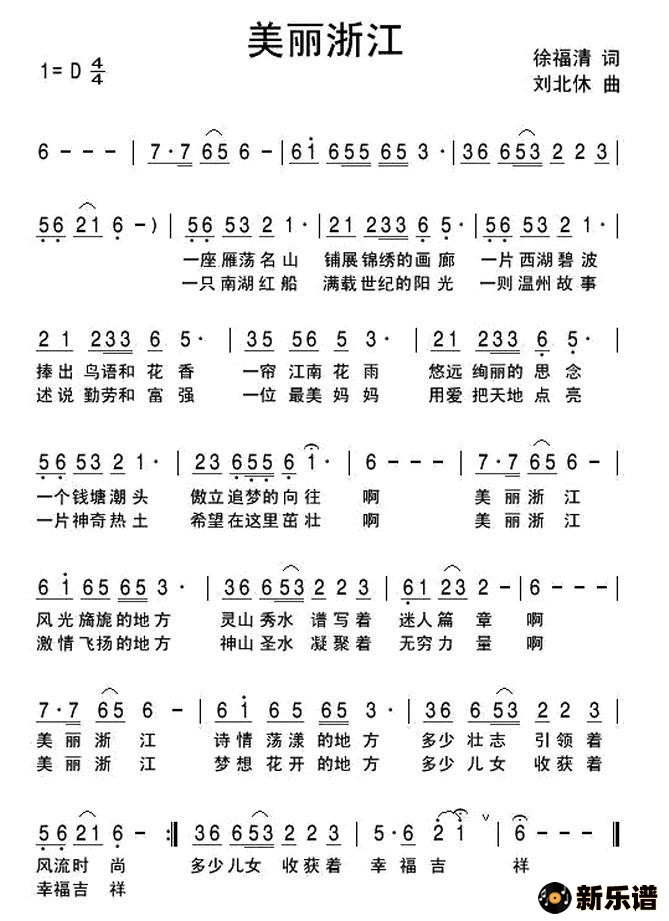 演唱的美丽浙江(徐福清词 刘北休曲)歌词,美丽浙江(徐福清词 刘北休曲)简谱.
