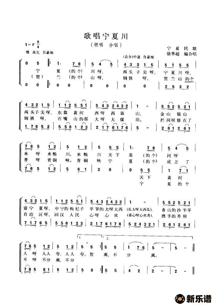 > 歌唱宁夏川(合唱)简谱