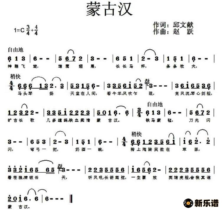 演唱的蒙古汉(邱文献词 赵跃曲)歌词,蒙古汉(邱文献词 赵跃曲)简谱.