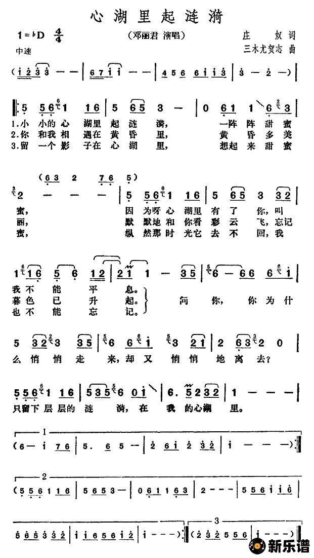 邓丽君演唱的心湖里起涟渏歌词,心湖里起涟渏简谱.
