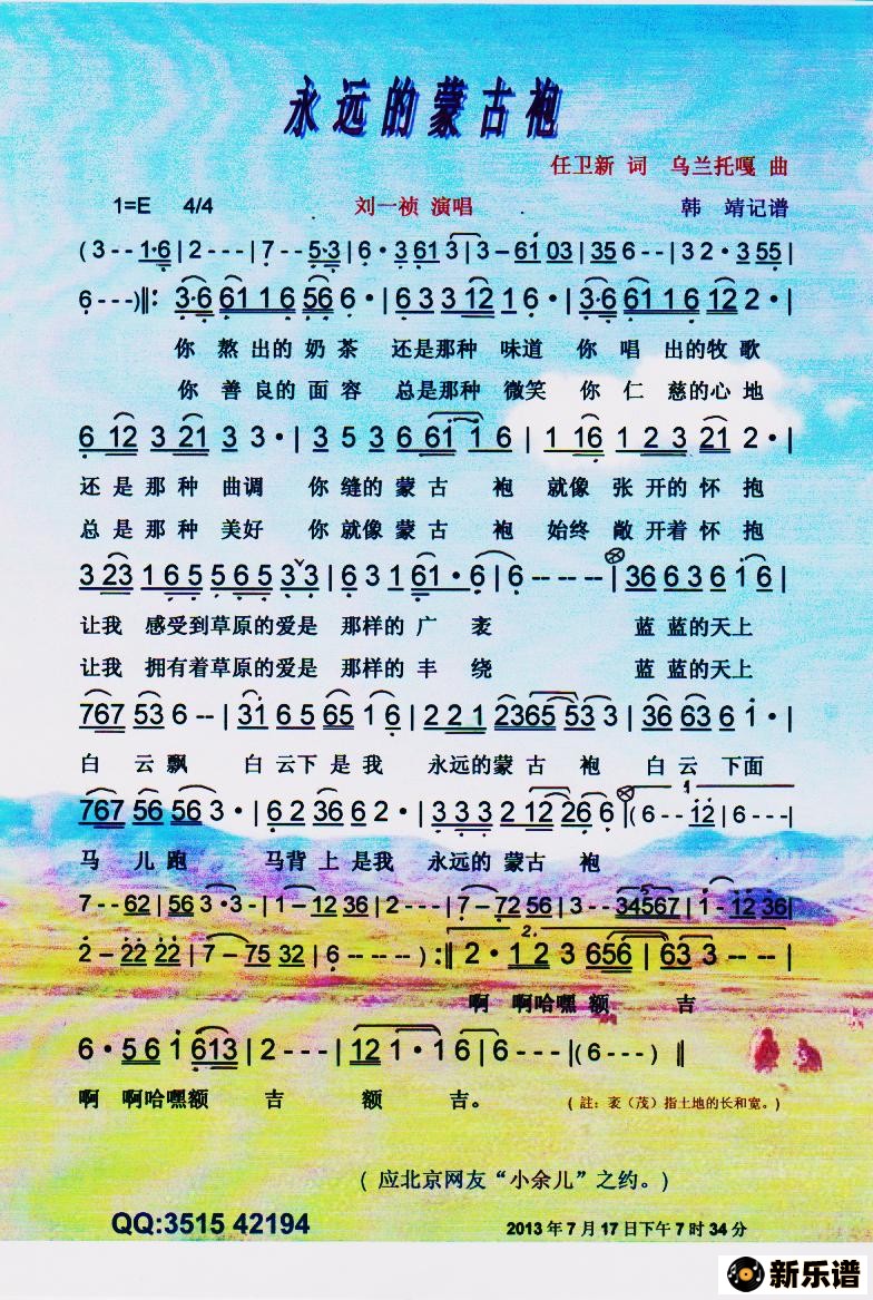 刘一祯演唱的永远的蒙古袍【彩谱】歌词,永远的蒙古袍【彩谱】简谱.
