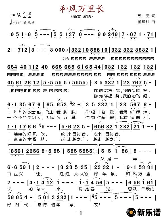 杨雪演唱的和风万里长歌词,和风万里长简谱.