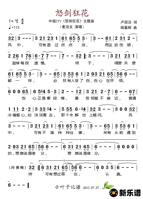 《怒剑狂花(中视CTV《怒剑狂花》主题曲)》简谱 麦洁文-小叶子制谱