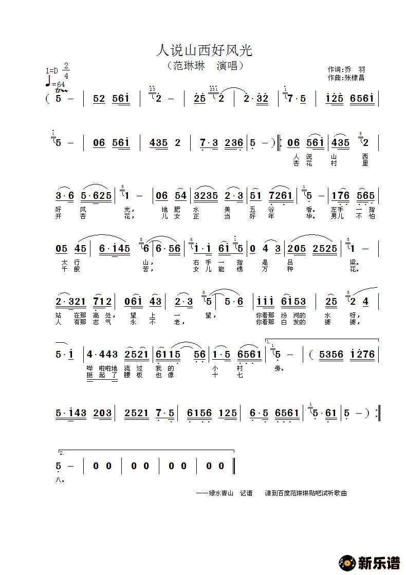 范琳琳演唱的范琳琳——人说山西好风光歌词,范琳琳——人说山西好风光简谱.