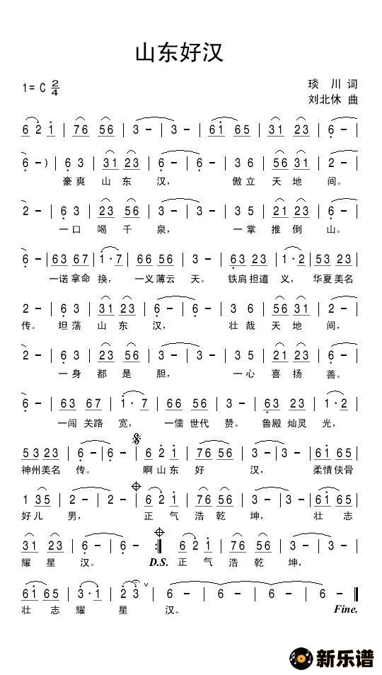 演唱的山东好汉(琰川词 刘北休曲)歌词,山东好汉(琰川词 刘北休曲)简谱.