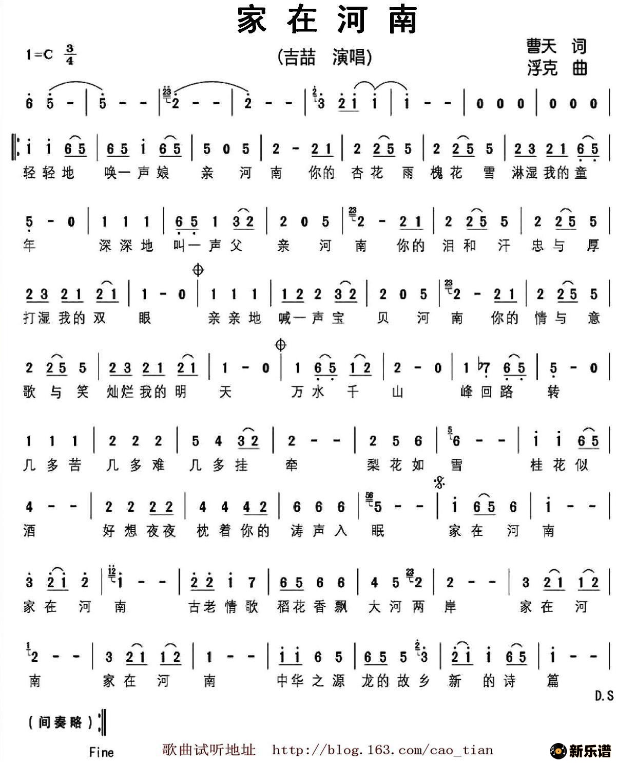 吉喆演唱的家在河南(曹天词 浮克曲)歌词,家在河南(曹天词 浮克曲)简谱.