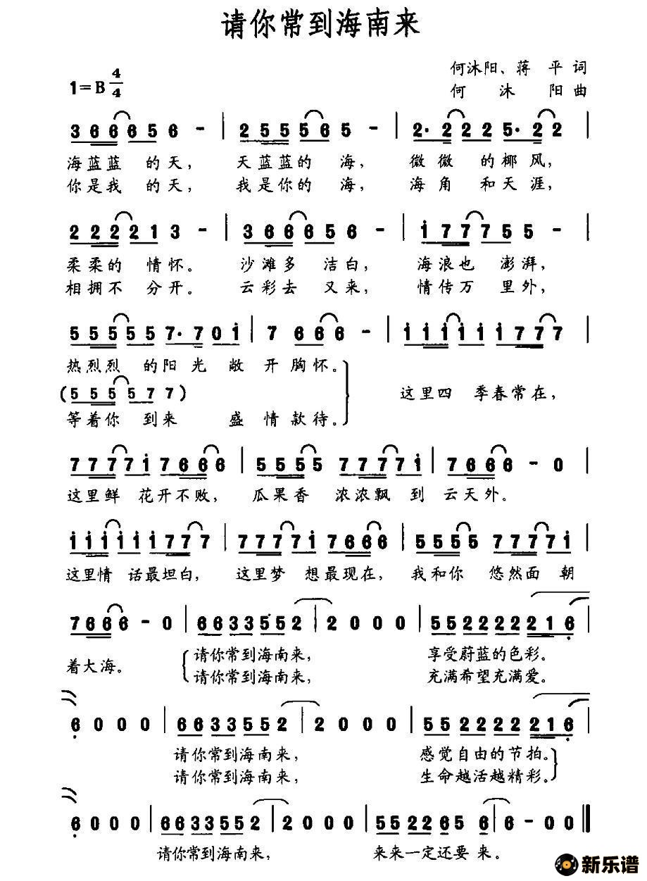 演唱的请你常到海南来歌词,请你常到海南来简谱.