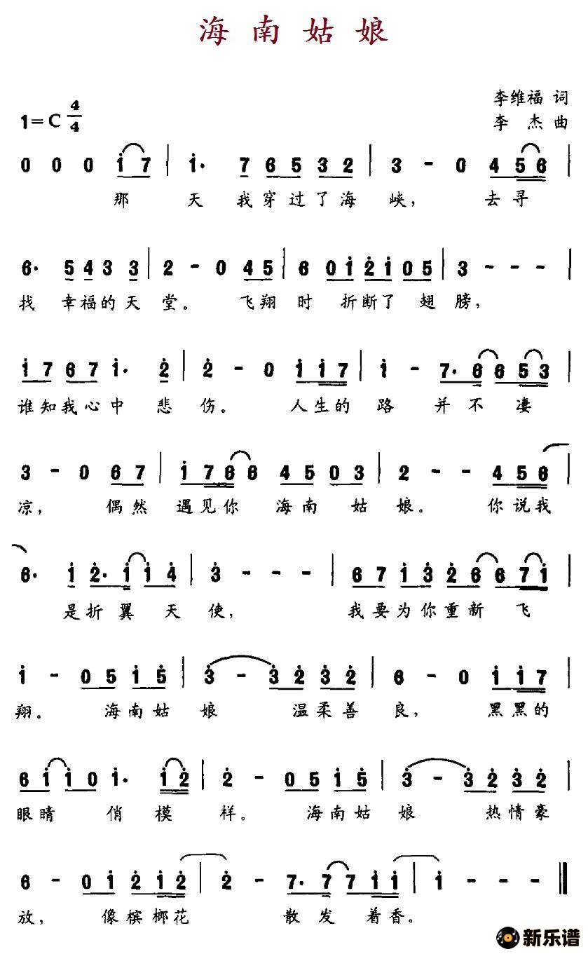 演唱的海南姑娘(李维福词 李杰曲)歌词,海南姑娘(李维福词 李杰曲)简谱.