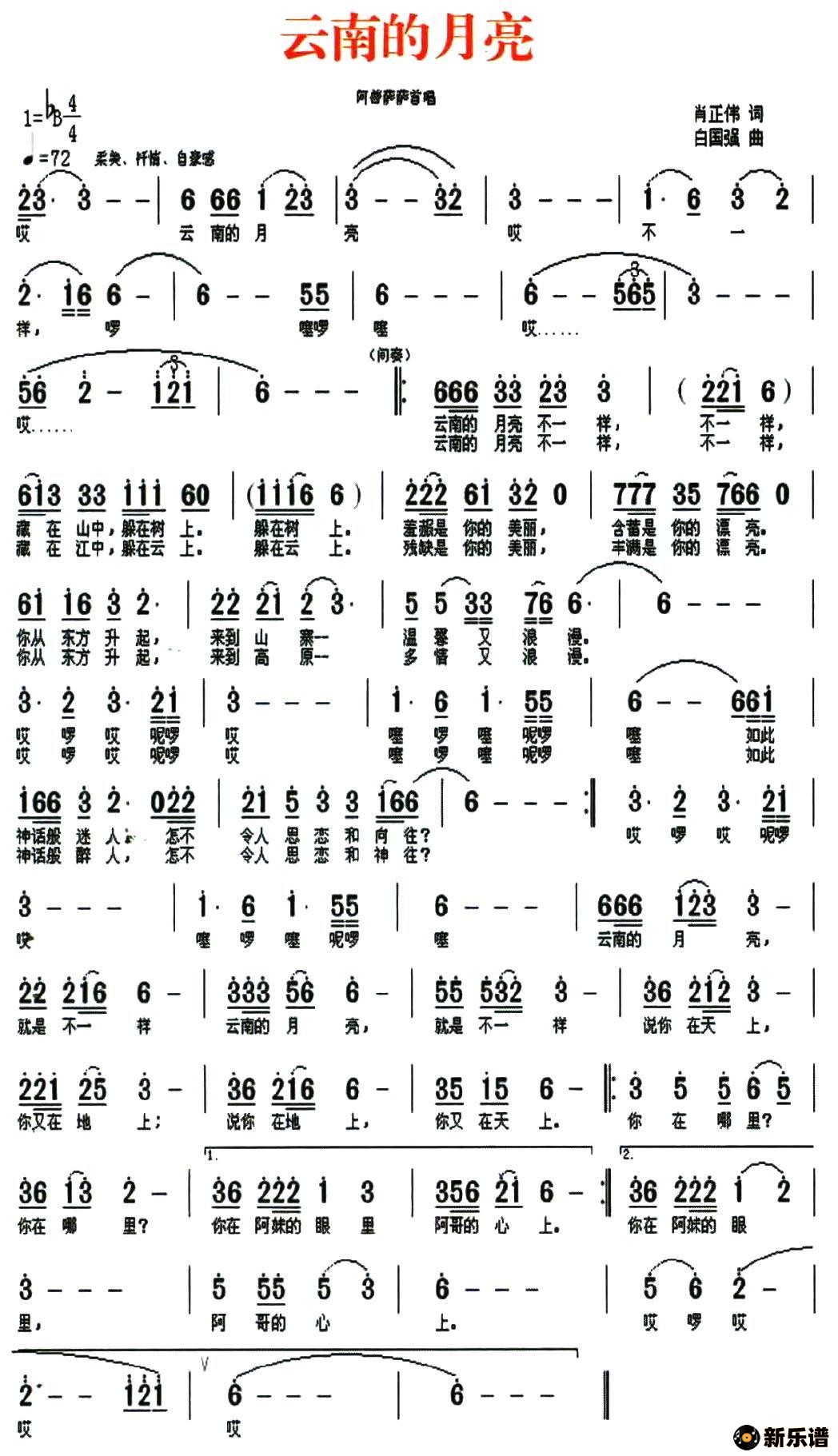 阿普萨萨演唱的云南的月亮歌词,云南的月亮简谱.