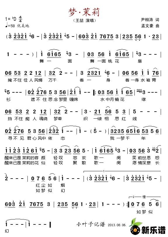 《梦.茉莉》简谱 王喆-小叶子制谱