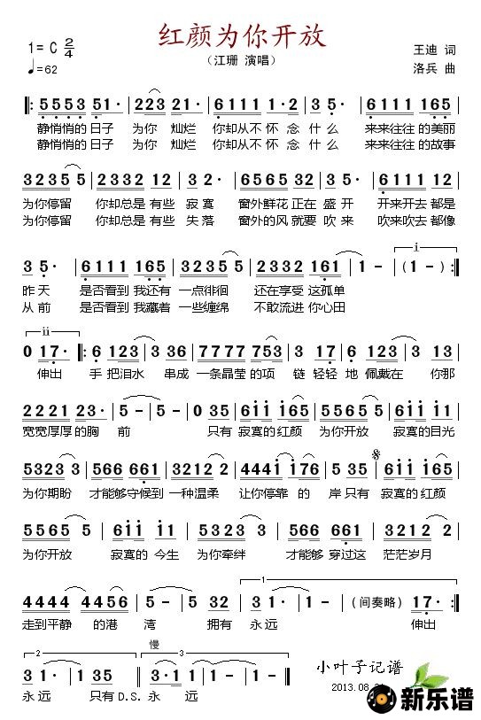 《红颜为你开放》简谱 江珊-小叶子制谱