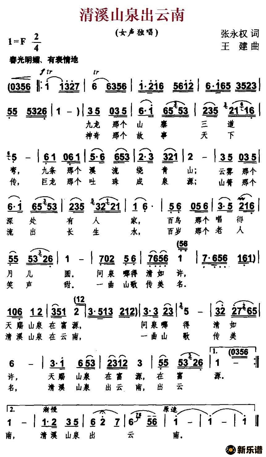 演唱的清溪山泉出云南歌词,清溪山泉出云南简谱.