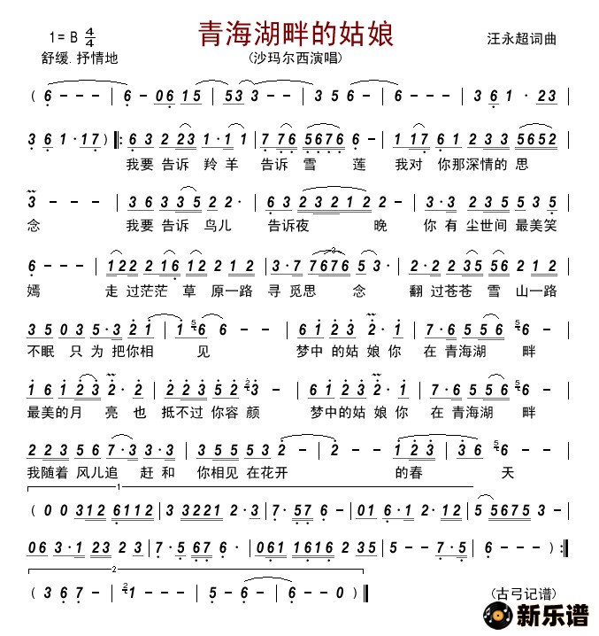 沙玛尔西演唱的青海湖畔的姑娘歌词,青海湖畔的姑娘简谱.