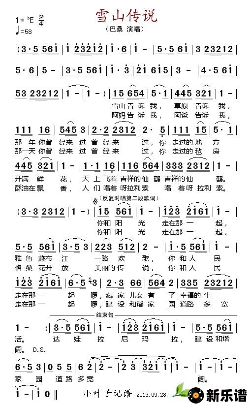 巴桑演唱的雪山传说歌词,雪山传说简谱.