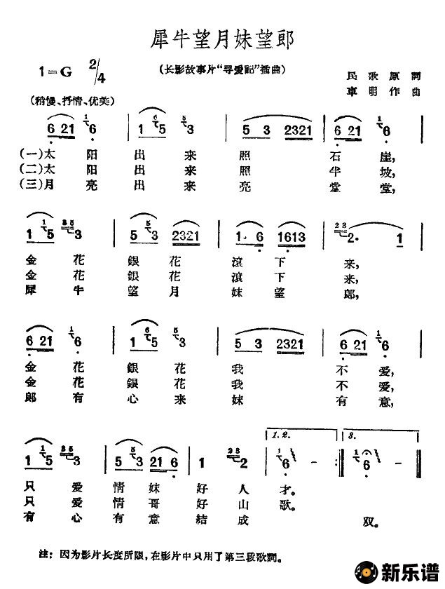 演唱的犀牛望月妹望郎(电影《寻爱记》插曲)歌词,犀牛望月妹望郎(电影《寻爱记》插曲)简谱.