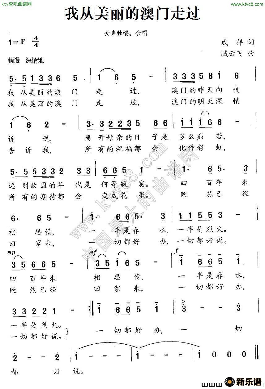 演唱的我 从美丽的澳门走过歌词,我 从美丽的澳门走过简谱.