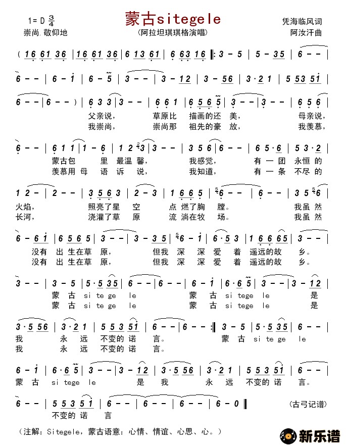 阿拉坦琪琪格演唱的蒙古sitegele歌词,蒙古sitegele简谱.