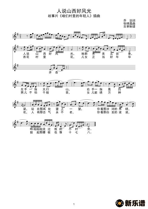 演唱的人说山西好风光(线谱)歌词,人说山西好风光(线谱)简谱.