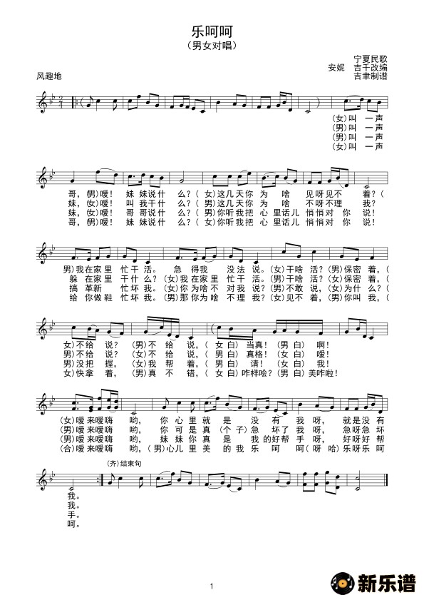 演唱的乐呵呵(宁夏民歌)线谱歌词,乐呵呵(宁夏民歌)线谱简谱.