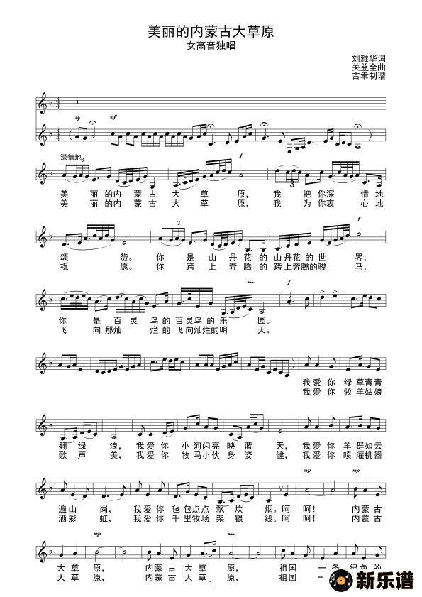 演唱的美丽的内蒙古大草原(线 谱)歌词,美丽的内蒙古大草原(线 谱)简谱.