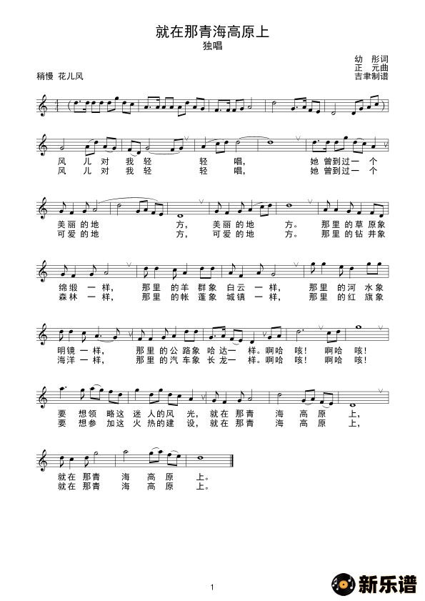 演唱的就在那青海高原上( 线谱 )歌词,就在那青海高原上( 线谱 )简谱.