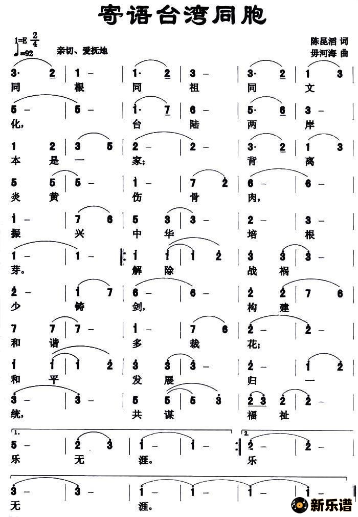 演唱的寄语台湾同胞歌词,寄语台湾同胞简谱.