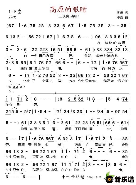 《高原的眼睛》简谱 王庆爽-小叶子制谱