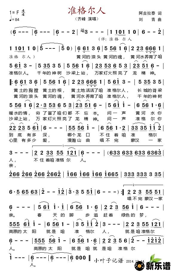 齐峰演唱的准格尔人歌词,准格尔人简谱.