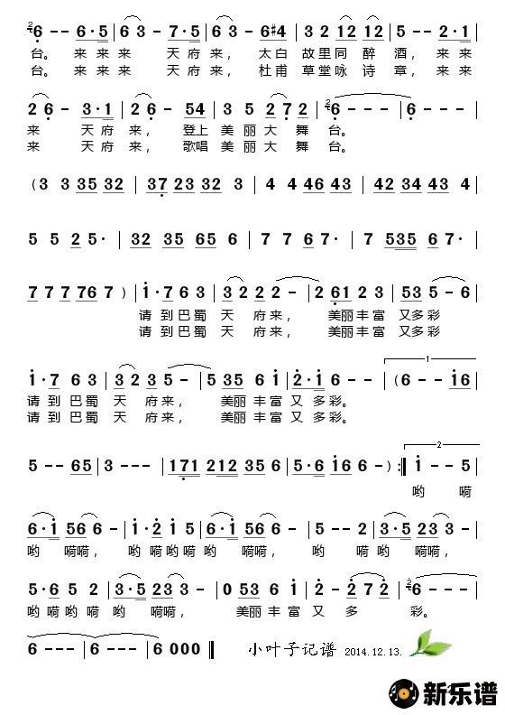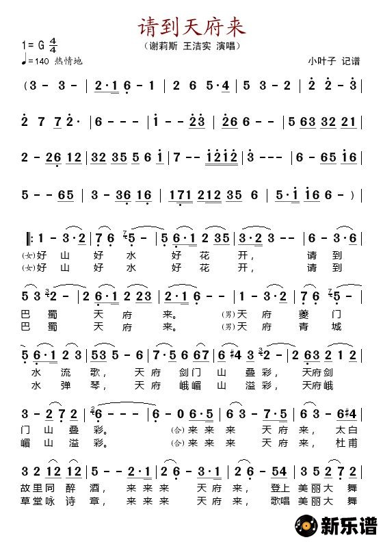 请到天府来(电视文艺专题片《天府之梦》选曲)谢莉斯/王洁实 谢莉斯/王洁实演唱的请到天府来(电视文艺专题片《天府之梦》选曲)歌词,请到天府来(电视文艺专题片《天府之梦》选曲)简谱. 此简谱由新乐谱会员 小叶子 上传