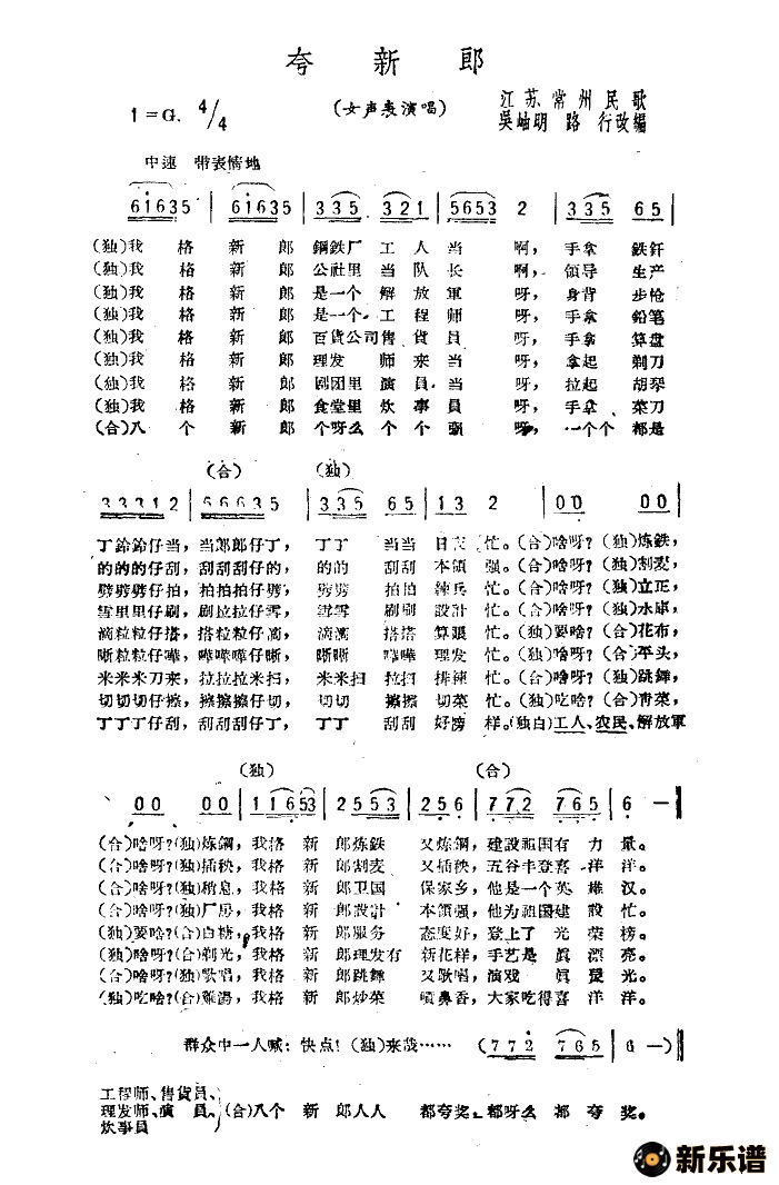 演唱的夸新郎(江苏民歌)歌词,夸新郎(江苏民歌)简谱.
