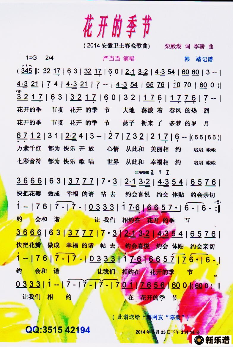 严当当演唱的花开的季节(2014安徽卫士春晚歌曲)【彩谱】歌词,花开的季节(2014安徽卫士春晚歌曲)【彩谱】简谱.