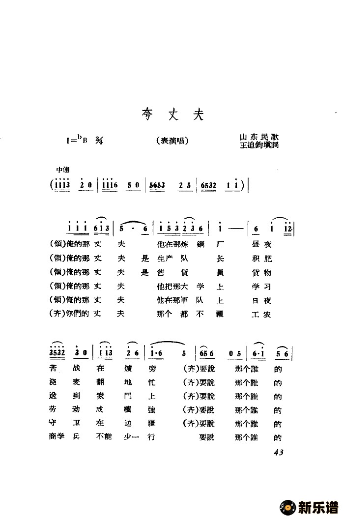 演唱的夸丈夫(山东民歌)歌词,夸丈夫(山东民歌)简谱.