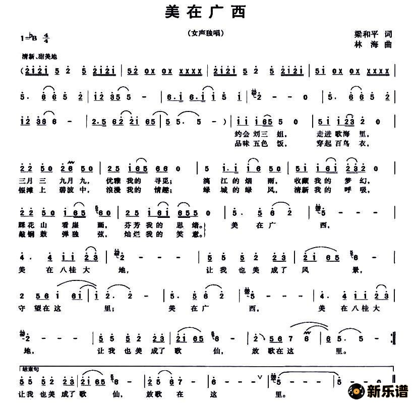 演唱的美在广西(梁和平词 林海曲)歌词,美在广西(梁和平词 林海曲)简谱.
