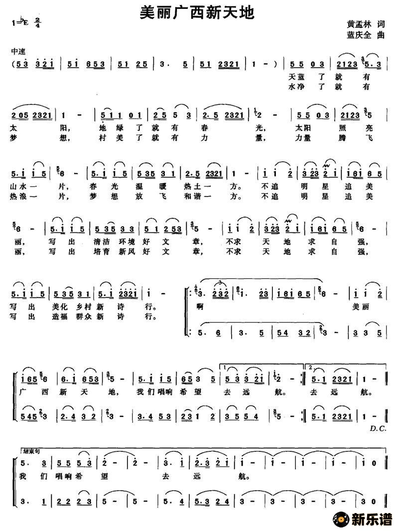 演唱的美丽广西新天地歌词,美丽广西新天地简谱.