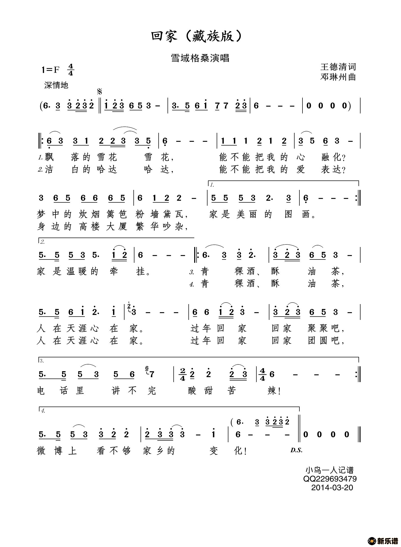 雪域格桑演唱的回家(藏族版)歌词,回家(藏族版)简谱.
