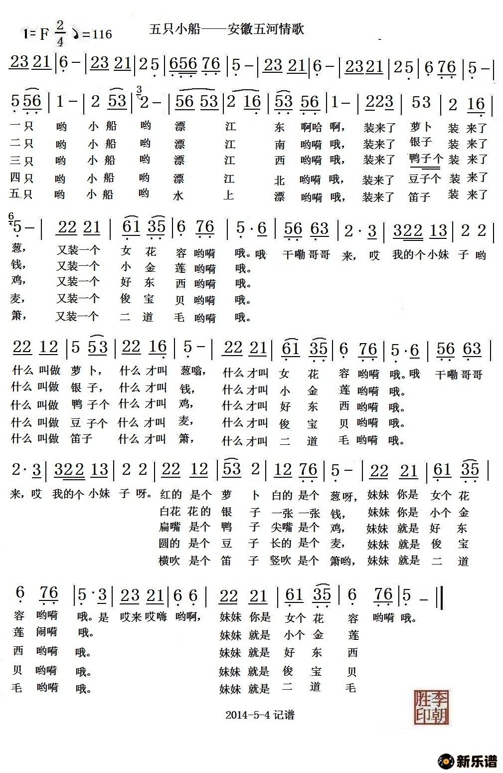 演唱的五只小船——安徽五河情歌歌词,五只小船——安徽五河情歌简谱.