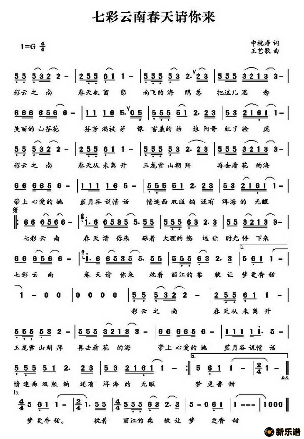 王艺歌演唱的七彩云南春天请你来歌词,七彩云南春天请你来简谱.