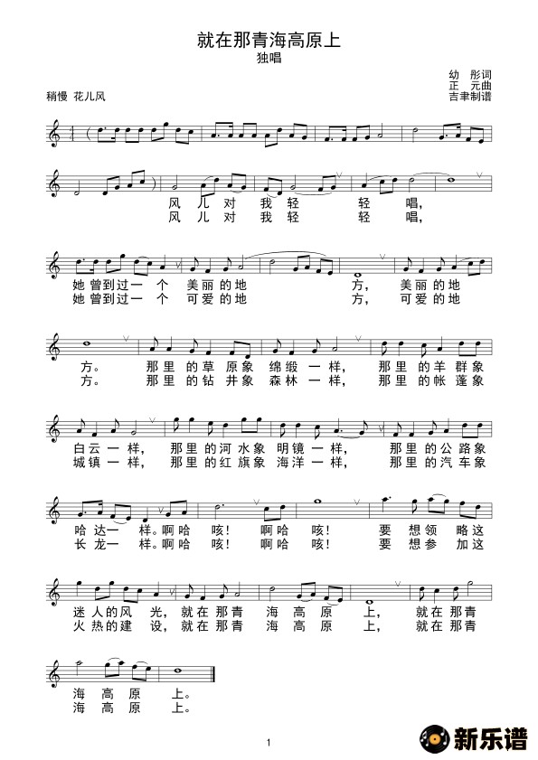 演唱的就在那青海高原上(线谱)歌词,就在那青海高原上(线谱)简谱.