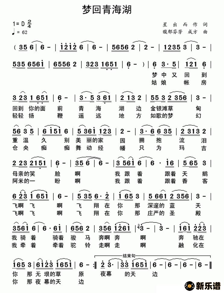 梦回青海湖(星出而作词 馥郁芬芳 成方曲)/ 相关曲谱