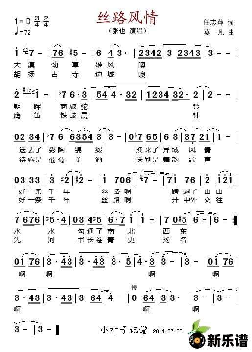 张也演唱的丝路风情歌词,丝路风情简谱.
