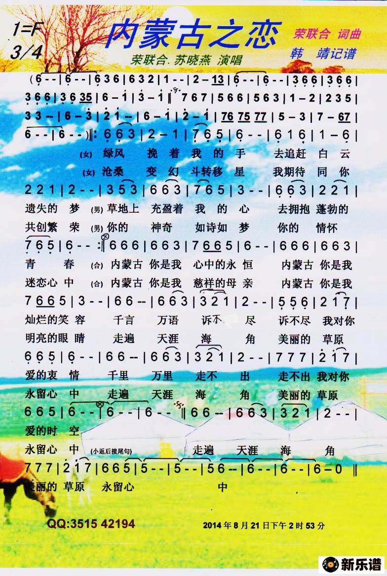 荣联合.苏晓燕演唱的内蒙古之恋【彩谱】歌词,内蒙古之恋【彩谱】简谱.