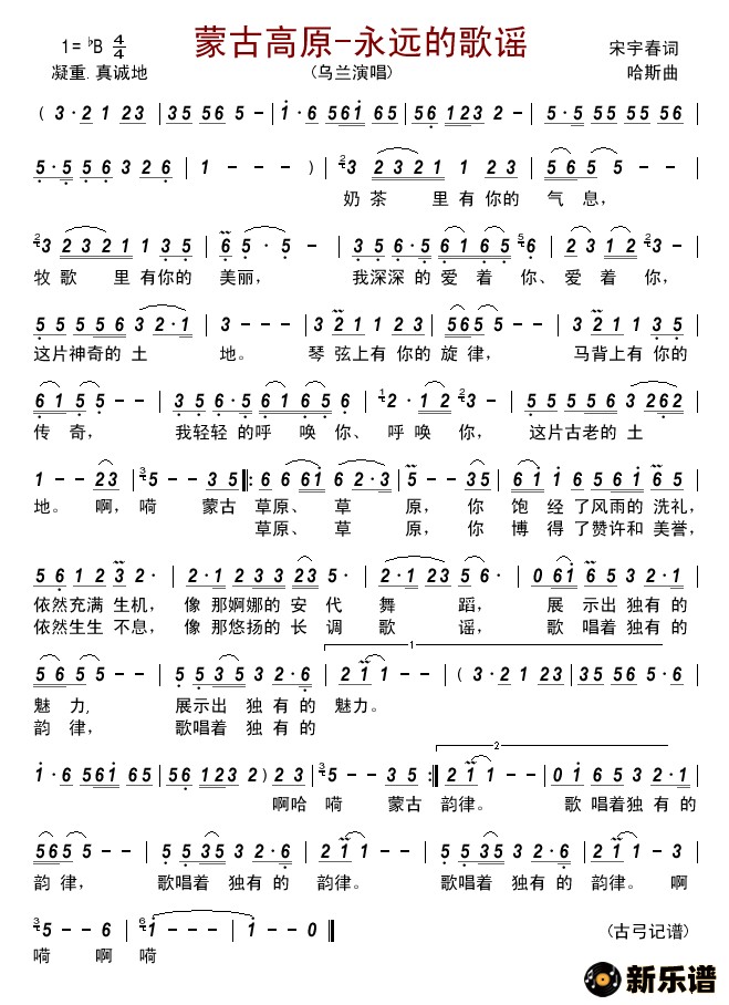 乌兰演唱的蒙古高原—永远的歌谣歌词,蒙古高原—永远的歌谣简谱.