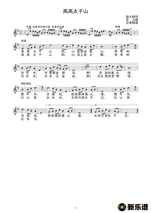 演唱的高高太子山(线谱)歌词,高高太子山(线谱)简谱.