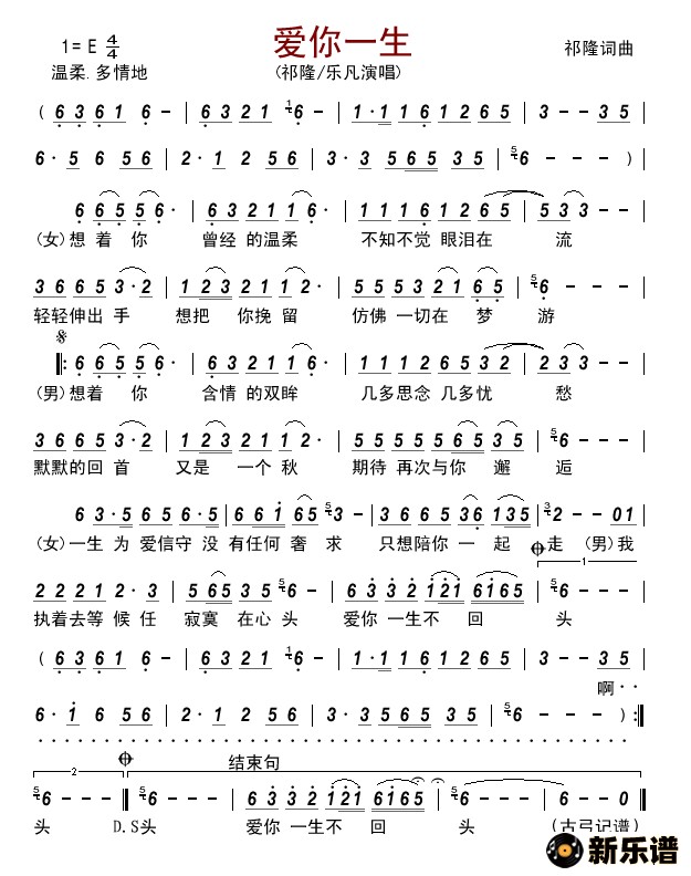 祁隆/乐凡演唱的爱你一生歌词,爱你一生简谱.
