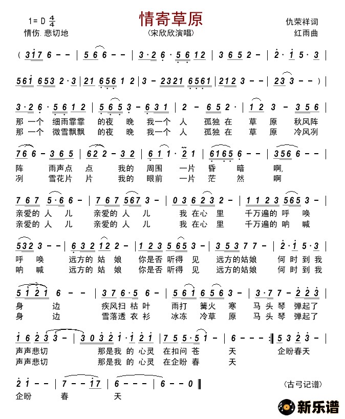 宋欣欣演唱的情寄草原歌词,情寄草原简谱.