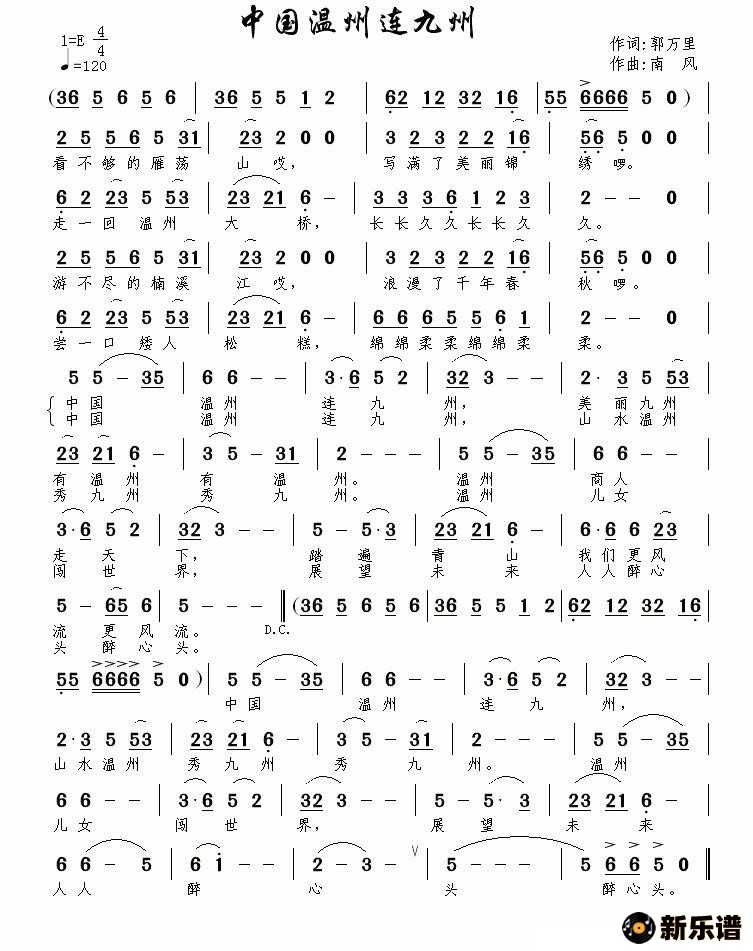 演唱的中国温州连九州歌词,中国温州连九州简谱.