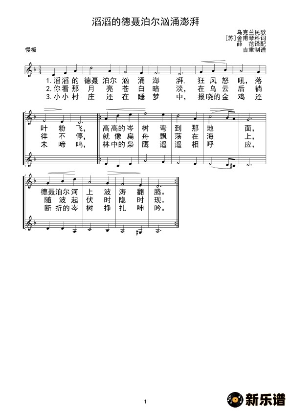 演唱的滔滔的德聂泊尔汹涌澎湃(线谱)歌词,滔滔的德聂泊尔汹涌澎湃(线谱)简谱.