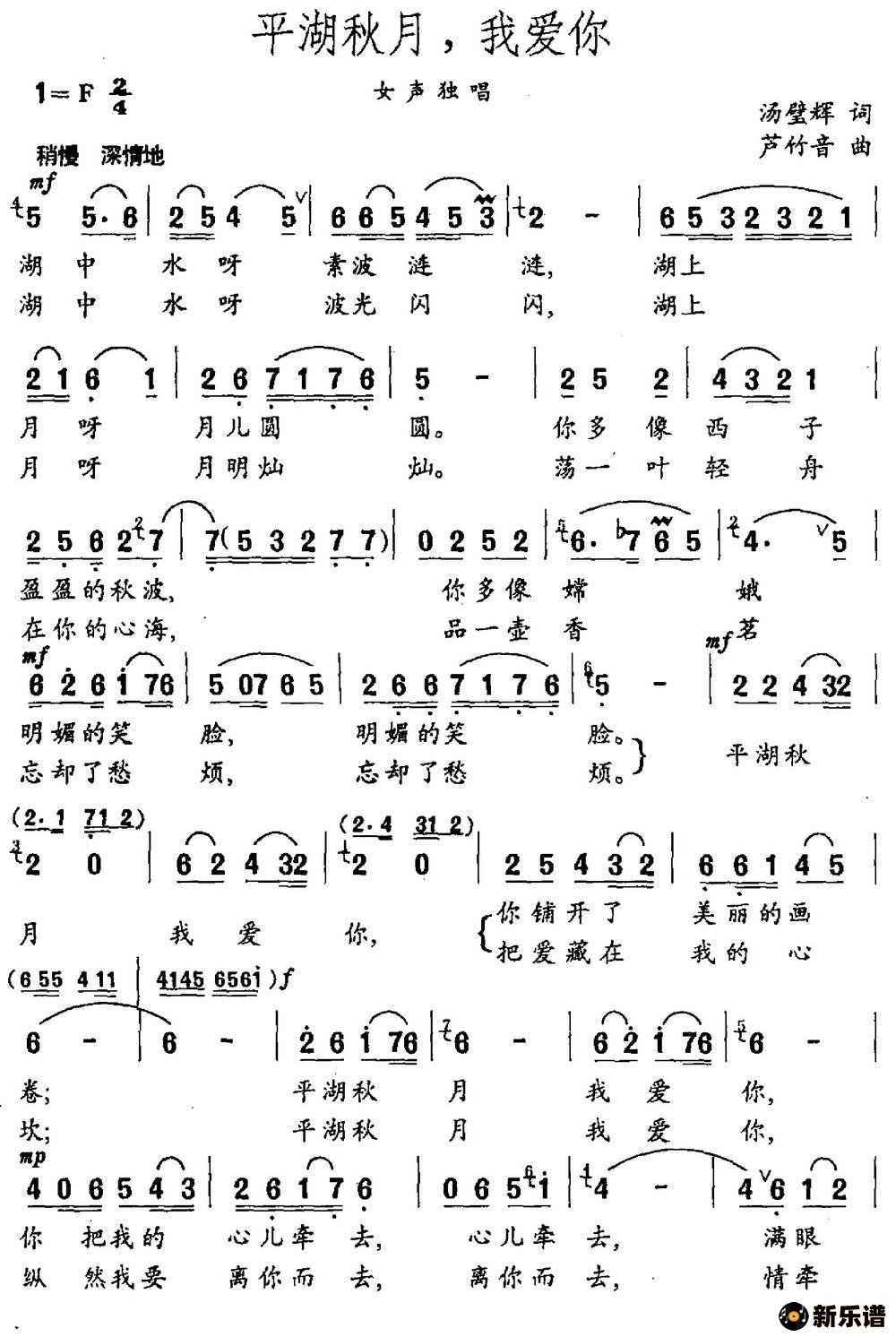 演唱的平湖秋月,我爱你(汤璧辉词 芦竹音曲)歌词,平湖秋月,我爱你(汤璧辉词 芦竹音曲)简谱.