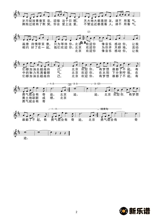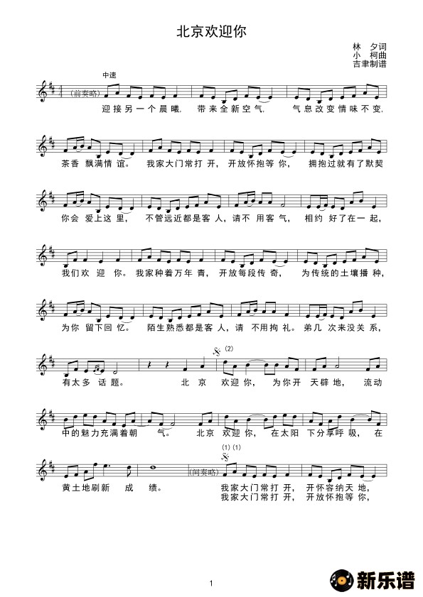 演唱的北京欢迎你(线谱)歌词,北京欢迎你(线谱)简谱.